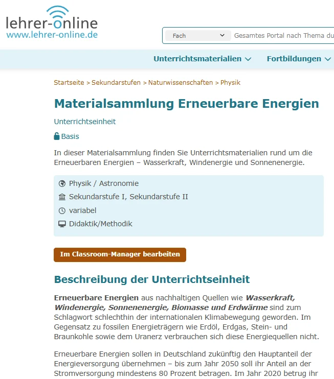 In diesem Handbuch der Ludwig-Maximilian-Universität (LMU) aus München finden sich Unterrichtsmaterialien zu Erneuerbaren Energien für den Physikunterricht.