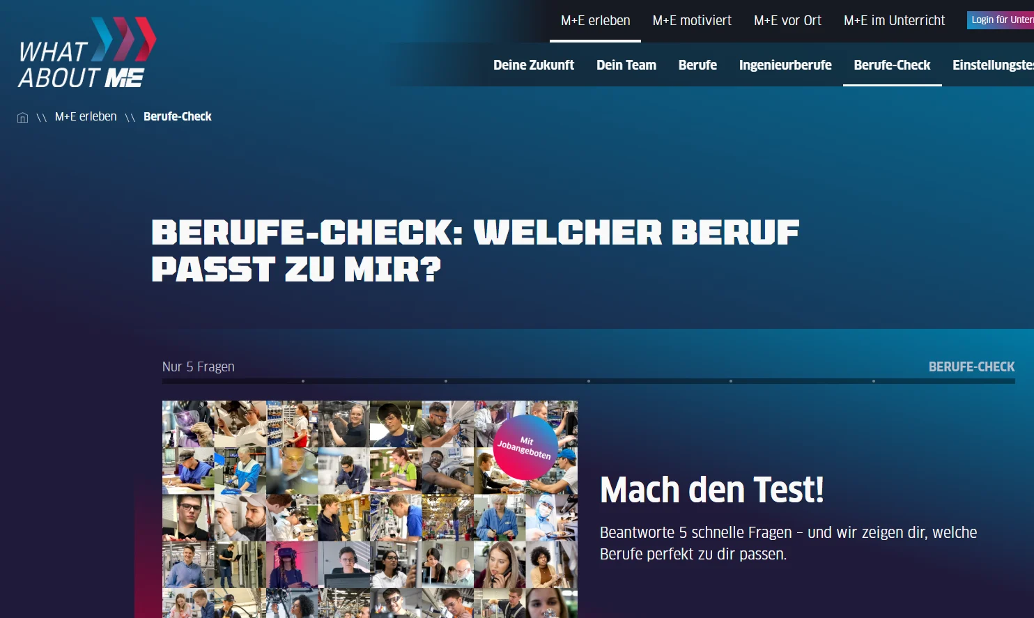 Elektrogenie, Bastler, Computerfreak, Zahlenfuchs oder Sprachtalent? Anhand dieser Auswahlkriterien werden Ausbildungsberufe in der Metall- und Elektroindustrie vorgestellt. Dabei werden neben notwendigen und wünschenswerten Fähigkeiten sowie Kompetenzen auch zentrale Tätigkeiten auch Ausbildungsinhalte und Informationen zum Ausbildungsgehalt gegeben. Darüber hinaus bietet die Webseite Videos, eine Online-Trainingseinheit zum Thema Einstellungstest und Informationen zu freien Ausbildungsplätzen. Alle Bausteine der Seite bieten Einsatzmöglichkeiten in der Sekundarstufe I und II zum Thema Berufsorientierung sowie im Fach Arbeit-Wirtschaft-Technik. Sie sollten jedoch immer von der Lehrkraft in einen methodisch-didaktischen Kontext eingebunden werden.