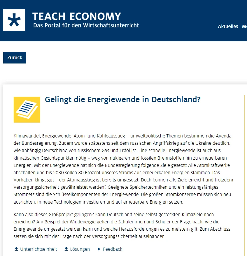 Klimawandel, Energiewende, Atom- und Kohleausstieg – umweltpolitische Themen bestimmen die Agenda der Bundesregierung. Zudem wurde spätestens seit dem russischen Angriffskrieg auf die Ukraine deutlich, wie abhängig Deutschland von russischem Gas und Erdöl ist. Eine schnelle Energiewende ist auch aus klimatischen Gesichtspunkten nötig – weg von nuklearen und fossilen Brennstoffen hin zu erneuerbaren Energien. Kann also dieses Großprojekt gelingen? Ein Planspiel von Teach Economy.