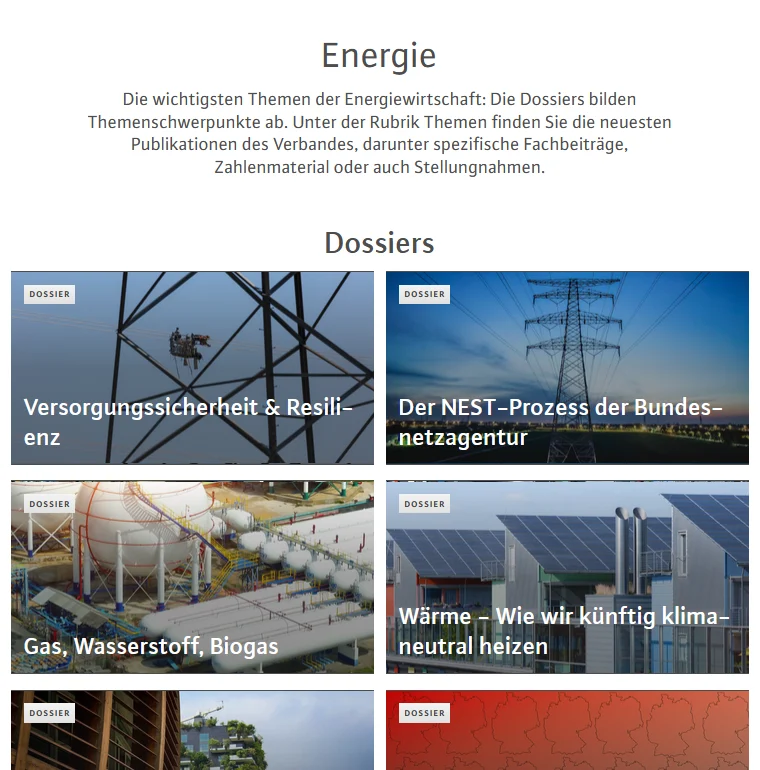 Die wichtigsten Themen der Energiewirtschaft: Die Dossiers des Bundesverbands der deutschen Energie- und Wasserwirtschaft BDEW bilden Themenschwerpunkte ab. Entdecken Sie beispielsweise Karten, Daten und Fakten zur Energiewirtschaft in Ihren Bundesländern oder das Dossier zu „Energie in Europa“.
