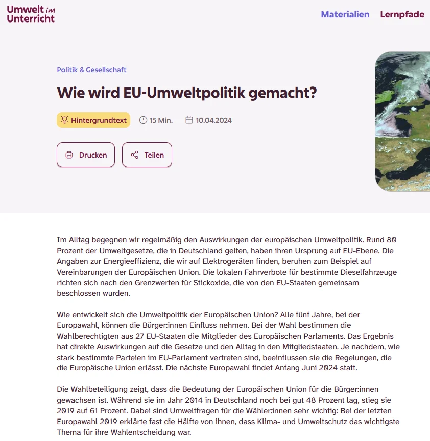 Welche Rolle spielt die Umweltpolitik in Europa und welchen Einfluss haben die Wählerinnen und Wähler darauf? Das ist Gegenstand dieses Hintergrundtextes vom Bildungsportal „Umwelt im Unterricht“ des Bundesministeriums für Umwelt, Naturschutz, nukleare Sicherheit und Verbraucherschutz.