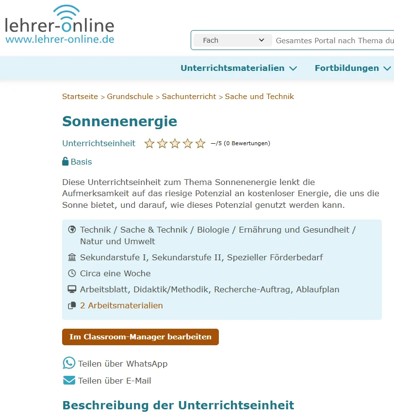 Unterrichtseinheit: Sonnenenergie (Lehrer-Online)