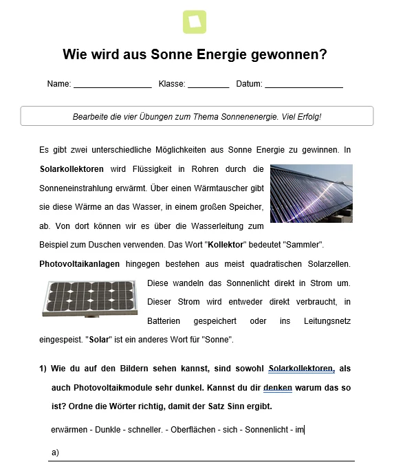 Das Thema Sonnenenergie wird grundsätzlich erklärt. Gleichzeitig wird der entscheidende Unterschied zwischen Solarkollektoren und Photovoltaik verdeutlicht. Dieses Übungsblatt kann gut als Hausübung oder als Einzelarbeit im Unterricht verwendet werden. Für die Grundschule geeignet.