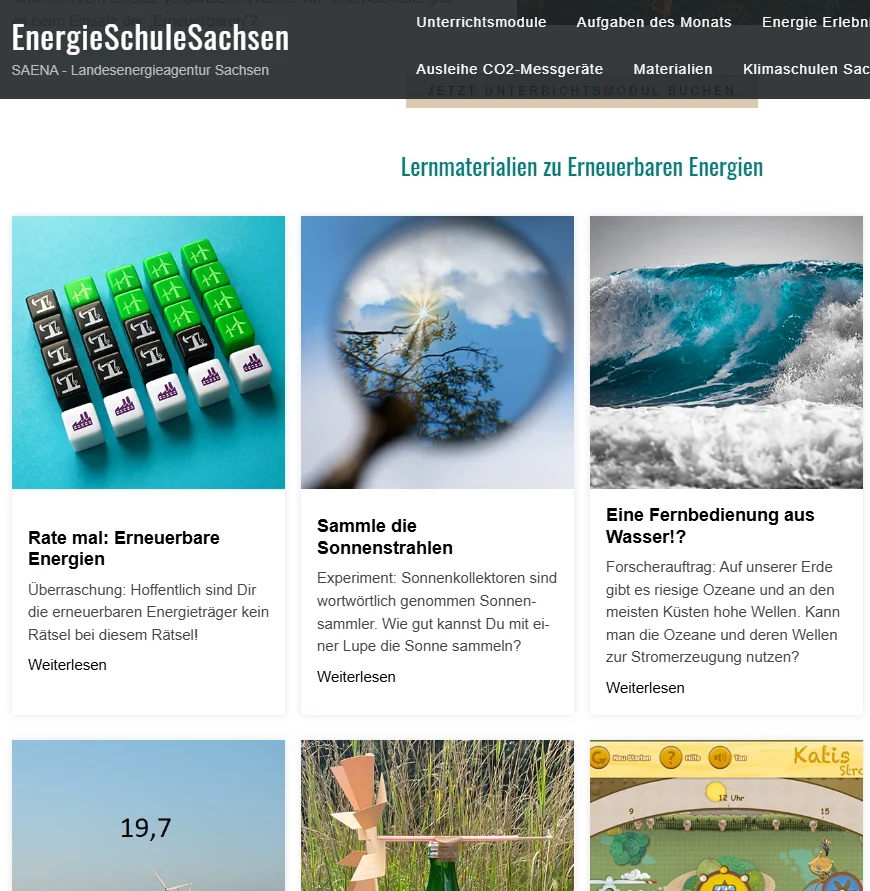 Das Portal „EnergieSchuleSachsen“ bietet zahlreiche Unterrichtsmaterialien zu den Erneuerbaren Energien an, von Arbeitsblättern zur Meeresenergie über Kreuzworträtsel zum Themenfeld Energie bis hin zum Energie-Führerschein. Zum selber lernen und Einsatz im Unterricht geeignet.