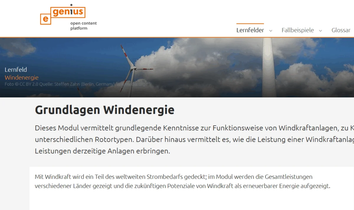 In diesem Lernfeld der Open Content-Plattform e-genius aus Österreich wird erklärt, wie eine Windkraftanlage funktioniert und aus welchen Komponenten sie sich zusammensetzt.